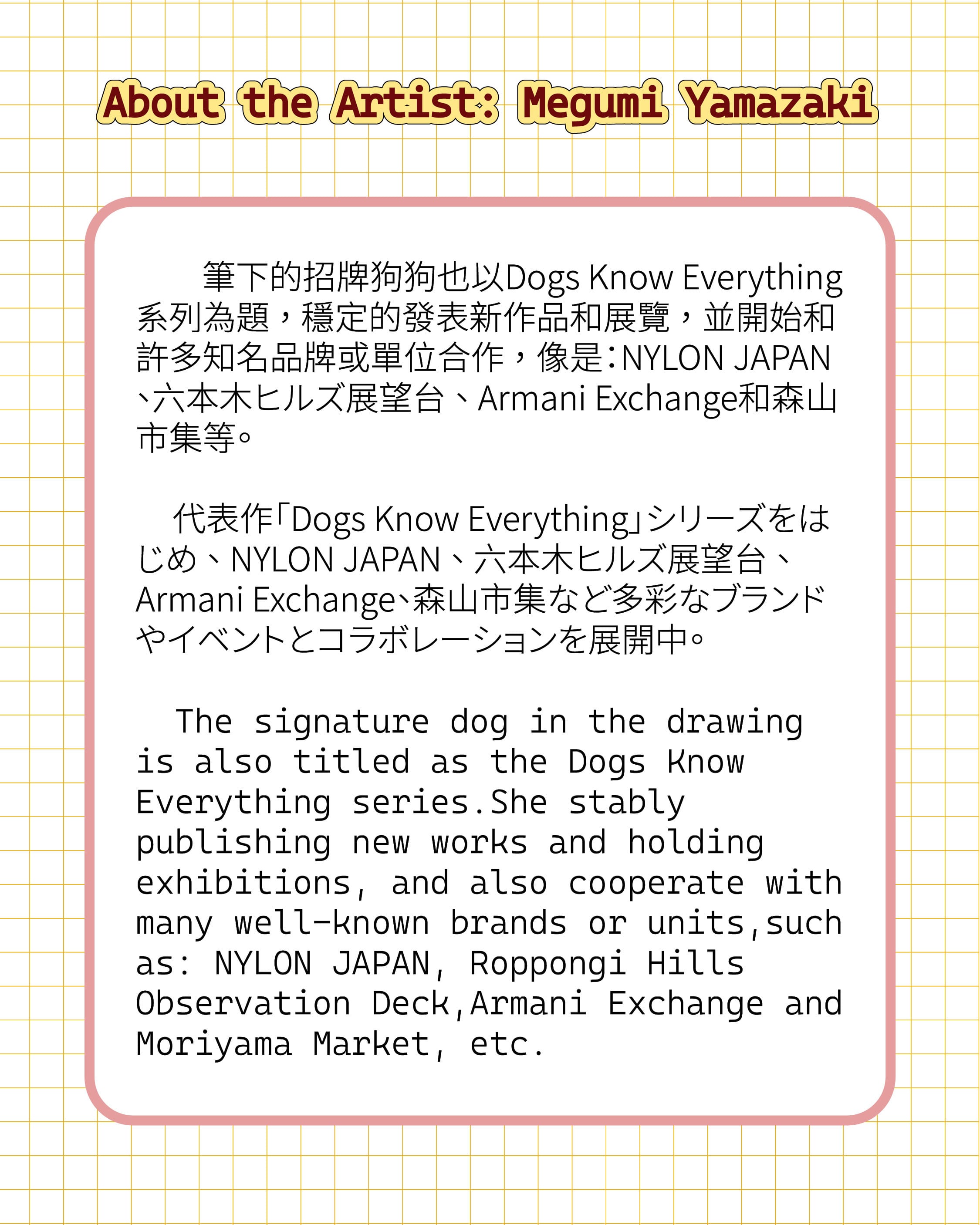 背中にはMegumi Yamazakiの代表的な⽝キャラクターが、