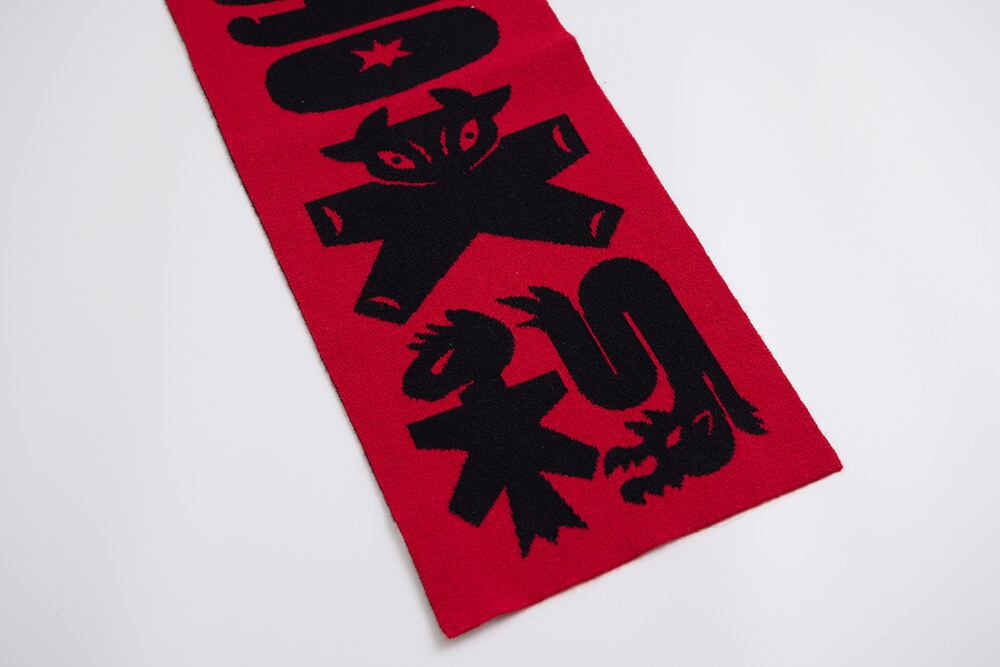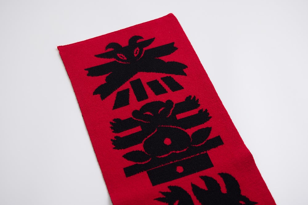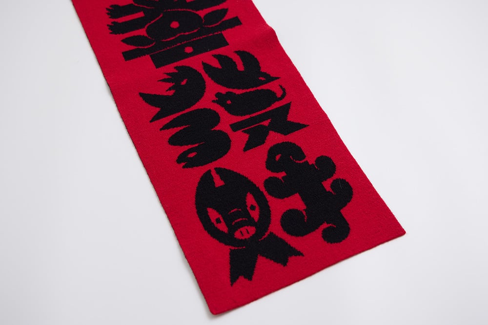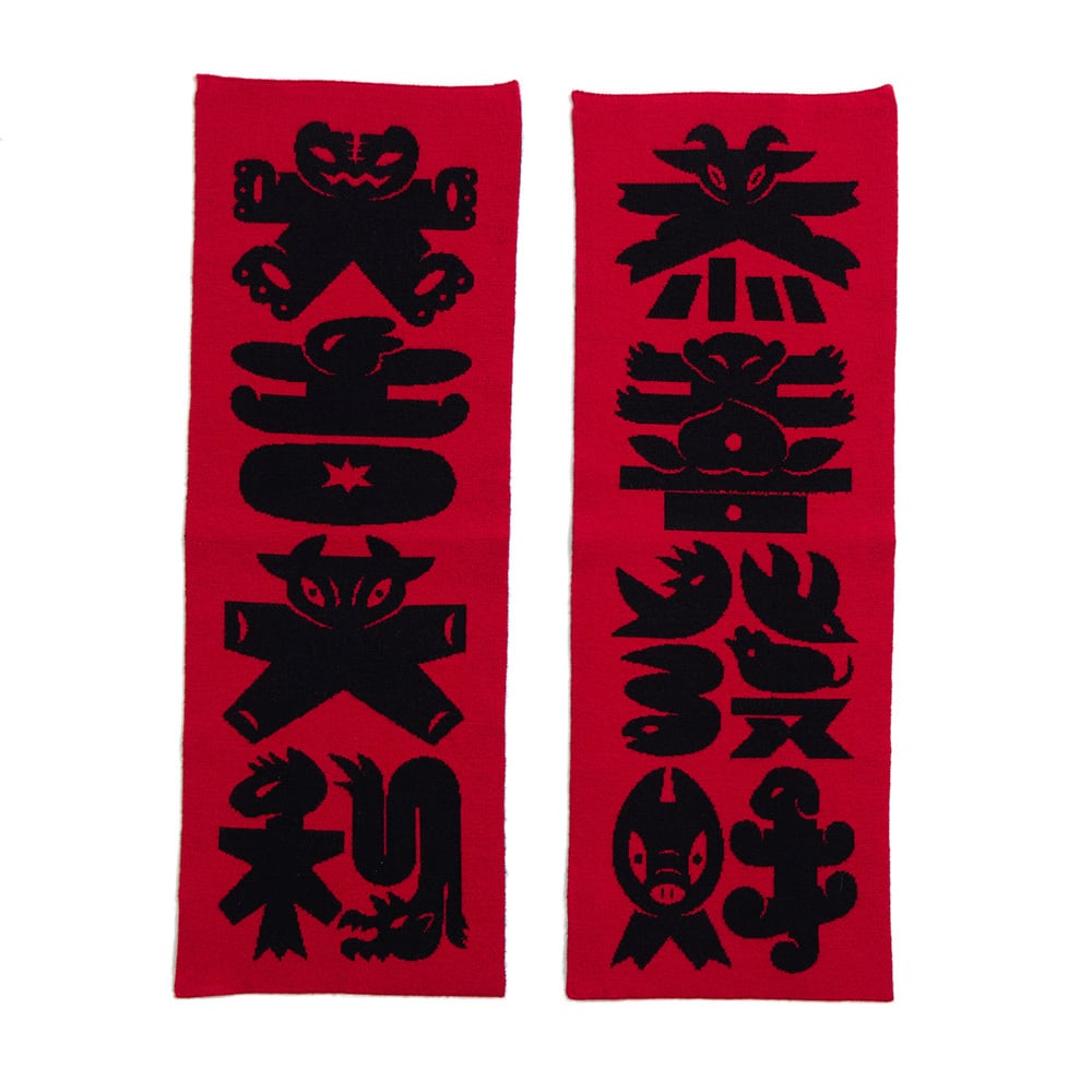 アーティスト・美山有がデザインした新年のご挨拶グラフィックを活かして制作したニット春聯です。「恭喜發財、大吉大利」という、年々親しまれてきた祝賀の言葉の中に、さりげなく十二支のモチーフが隠れています。洗練されたインテリアテキスタイルで、新しい気分を迎えましょう。