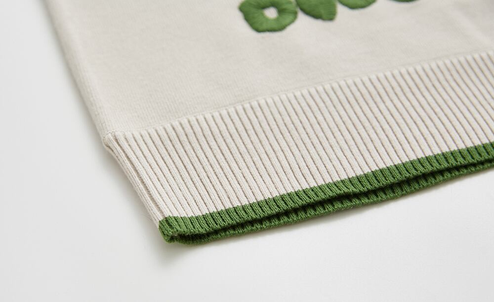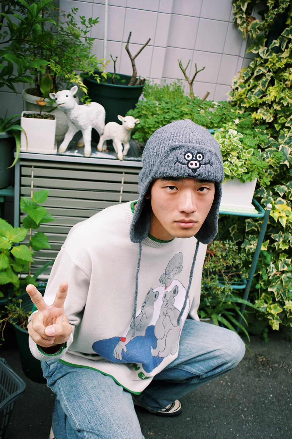 コアラを両腕に抱いた犬のニット。裾に入ったグリーンが気に入ってます。